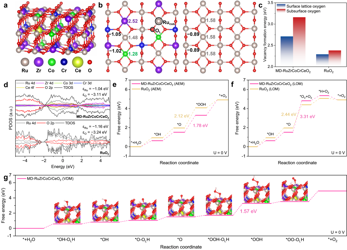 图5. DFT计算模拟。a) 金红石相MD-RuZrCoCrCeO2 (110)面的晶体结构。b) MD-RuZrCoCrCeO2和RuO2 (110)面上活性位点周围原子的Bader电荷计算。c) MD-RuZrCoCrCeO2和RuO2中表面晶格氧和亚表面氧的空位形成能。d) MD-RuZrCoCrCeO2和RuO2的投影态密度图。e) 在零电池电位下(U=0 V),MD-RuZrCoCrCeO2和RuO2 (110)面上AEM路径的吉布斯自由能图。f) 在零电池电位下(U=0 V),MD-RuZrCoCrCeO2和RuO2 (110)面上LOM路径的吉布斯自由能图。g) 在零电池电位下(U=0 V),MD-RuZrCoCrCeO2 (110)面上VDM路径的吉布斯自由能图。(g)中插图显示了MD-RuZrCoCrCeO2对氧中间体的相应模型。