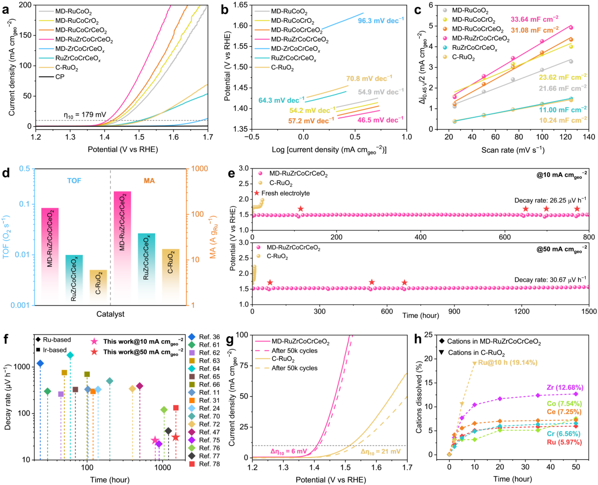 图3. 三电极体系中MD-RuZrCoCrCeO2及对照催化剂的酸性OER性能。a) 经85% iR校正后的LSV极化曲线。b) 塔菲尔斜率。c) 0.45 V(vs. RHE)下的电容电流与扫描速率的关系图,以及通过线性拟合估算的相应Cdl值。d) 在300 mV过电位、1 mg电极负载下,MD-RuZrCoCrCeO2、RuZrCoCrCeO2和C-RuO2的TOF和MA比较。e) MD-RuZrCoCrCeO2和C-RuO2在10和50 mA cm−2下的计时电位曲线。f) 在10 mA cm−2下,MD-RuZrCoCrCeO2与已报道的Ru基和Ir基OER电催化剂衰减率的比较。g) 循环稳定性测试前后,MD-RuZrCoCrCeO2和C-RuO2经85% iR校正的LSV极化曲线。h) 在50 mA cm−2下,溶解金属阳离子的ICP-MS分析。